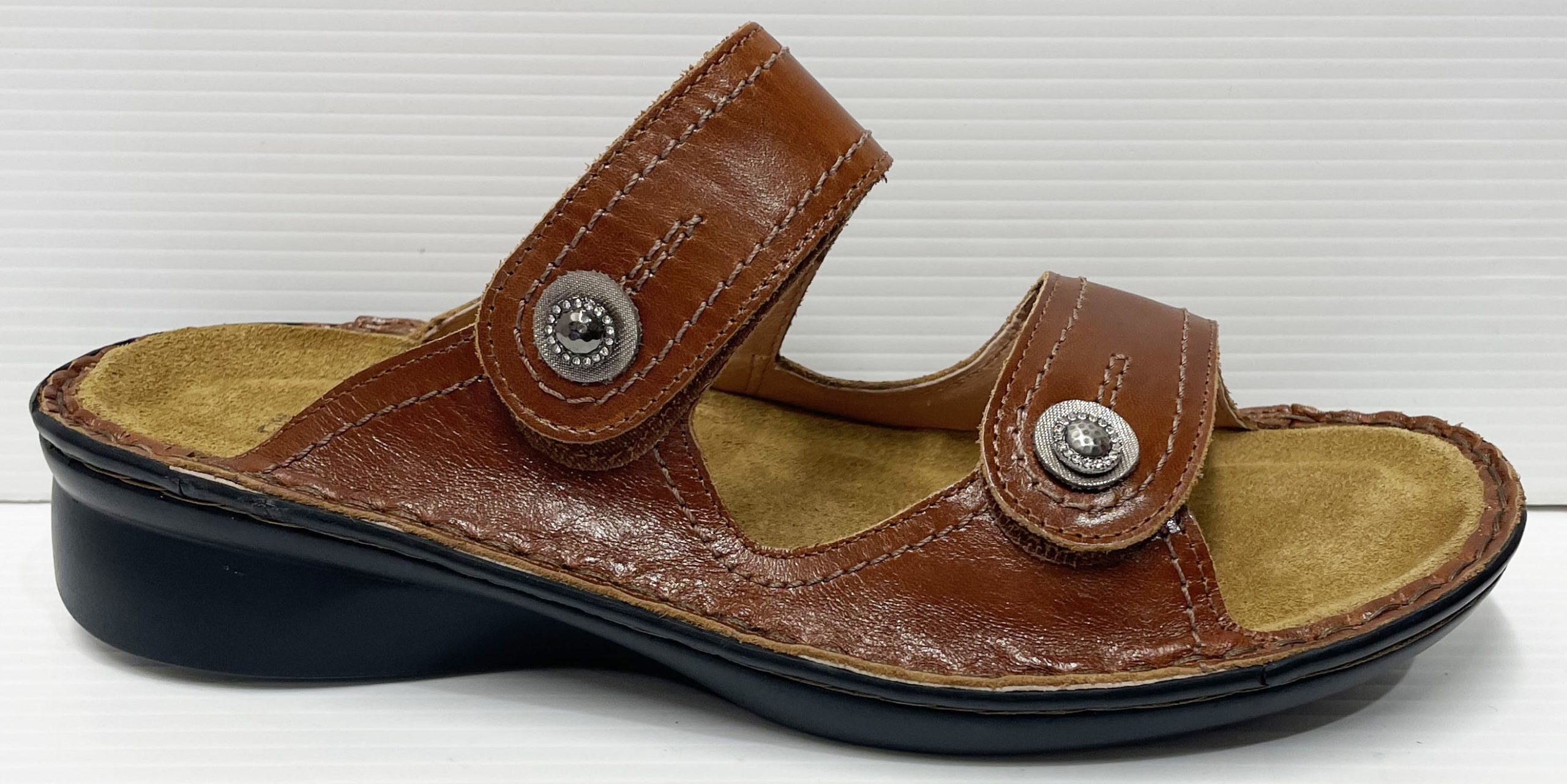 The Sitar is a fully adjustable orthotic-friendly slide on the Allegro collection. It features Velcro adjustability across both the instep and front strap as well as stylish faux ornamental buttons. This style also features NAOT’s removable anatomically-correct cork and latex innersole which is wrapped in soft suede which moulds to the foot with wear. The NAOT Women’s Allegro Collection features a 3.81 cm polyurethane sole with a splayed heel for increased stability and added comfort.