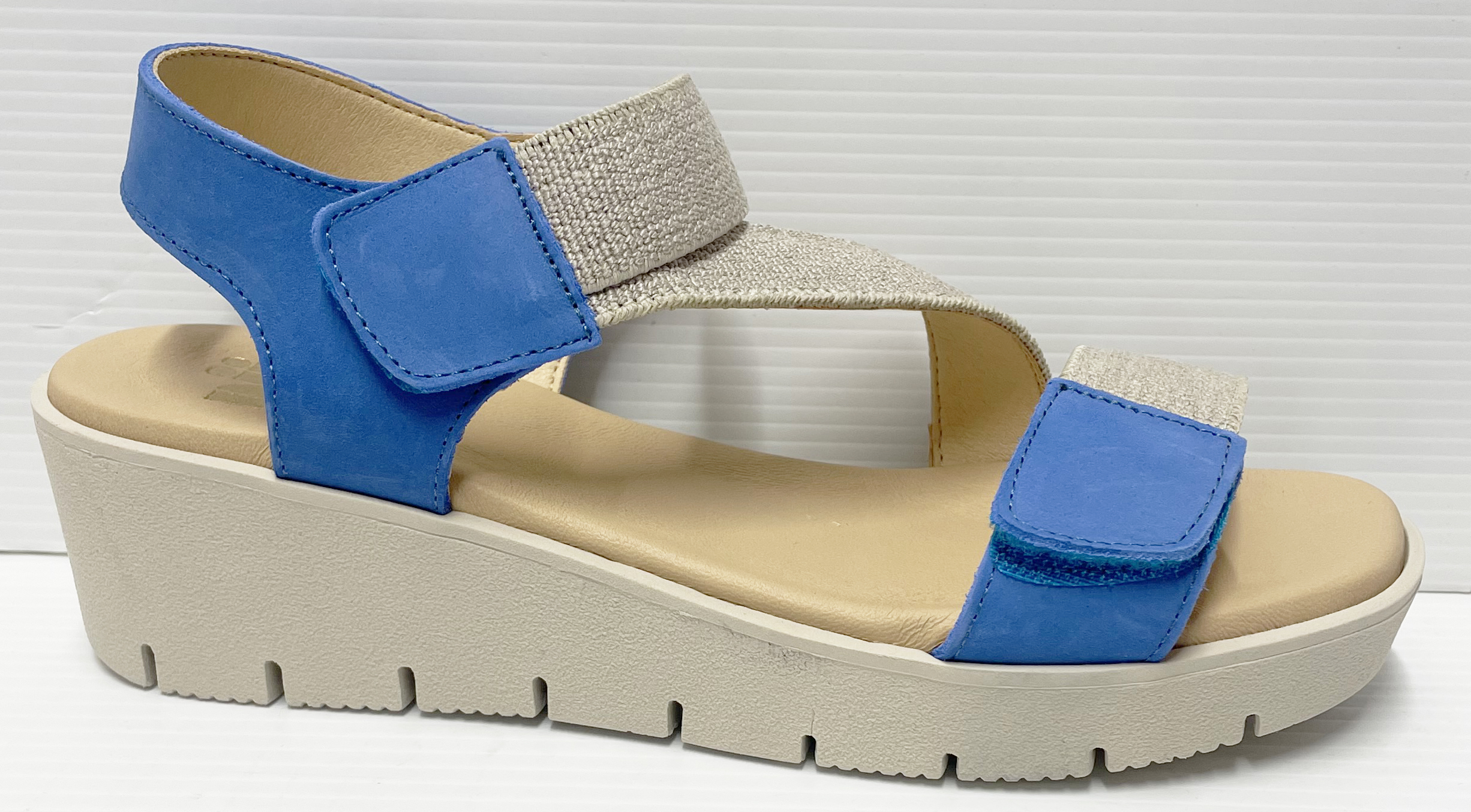 Elastic linen look  straps which are leather lined and then edged in leather. Velcro on the front strap and across the instep.